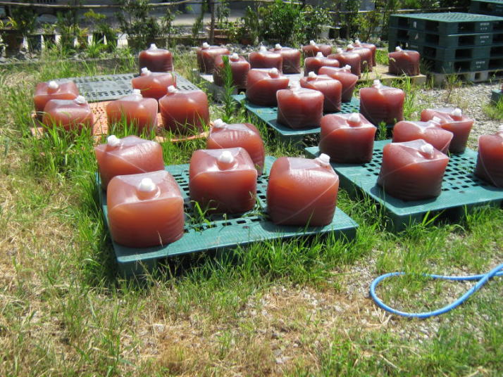 光合成菌の散布を始めました。20Lのキュウビナーを300Lのタンクで希釈して