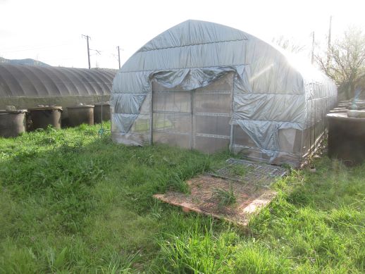 雨続きで肥料撒きが出来ないので、ヌカ保存用倉庫(ビニールハウス)の遮光ネットを張替えました。